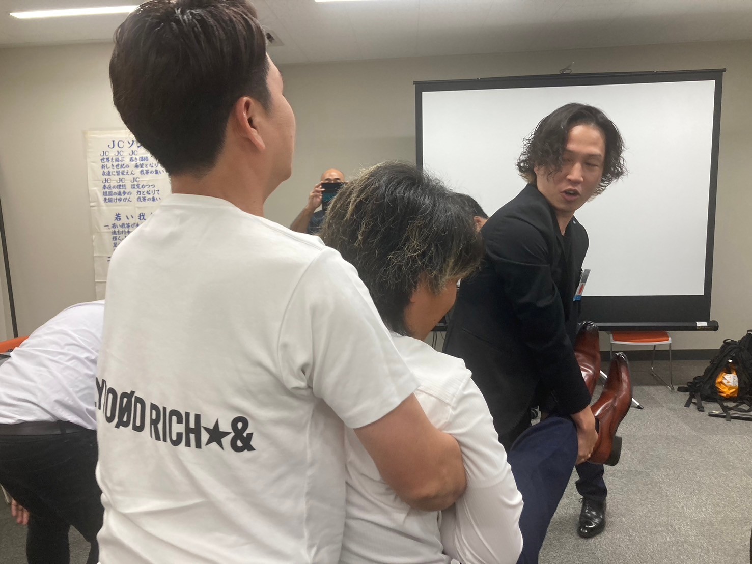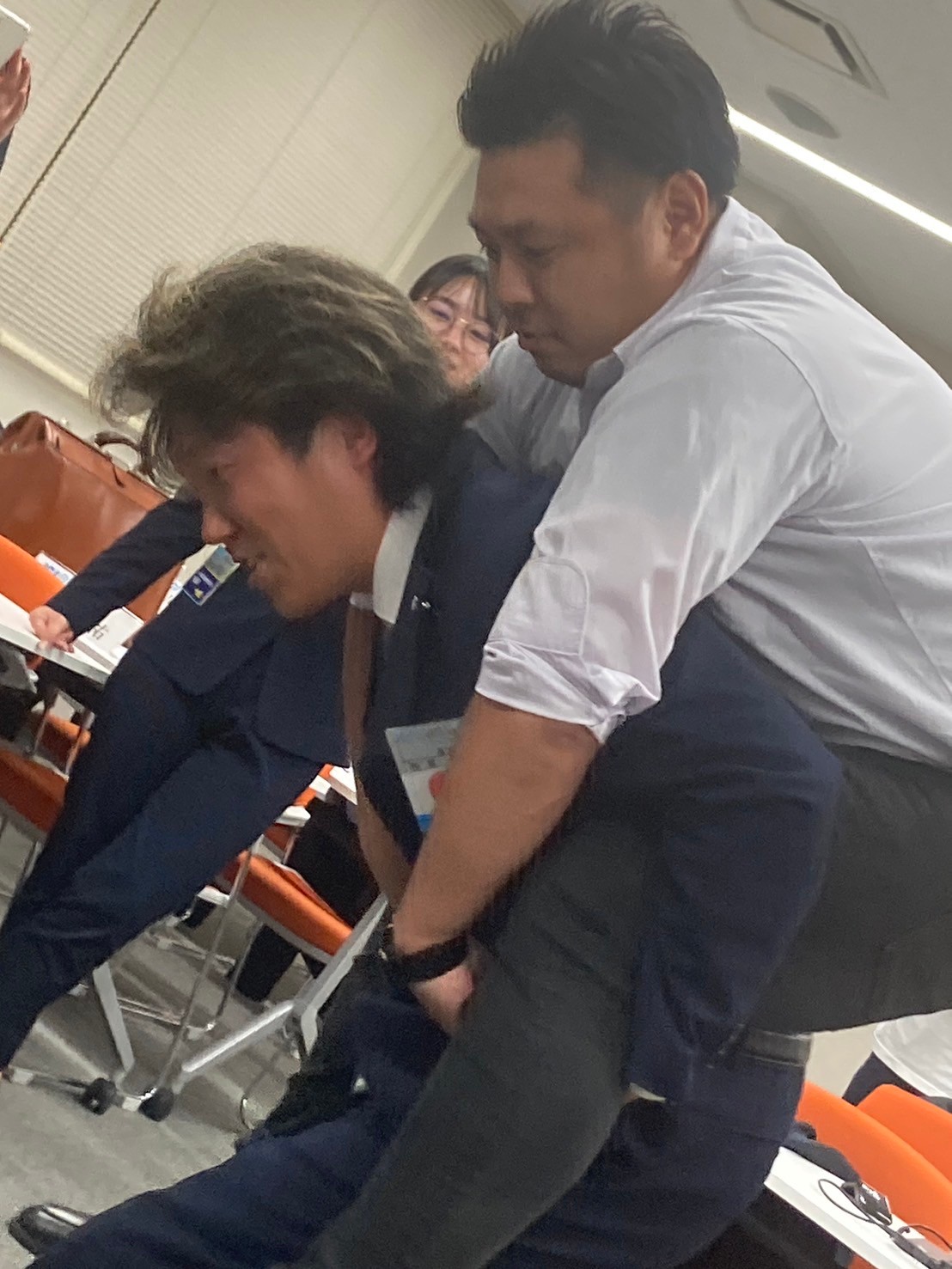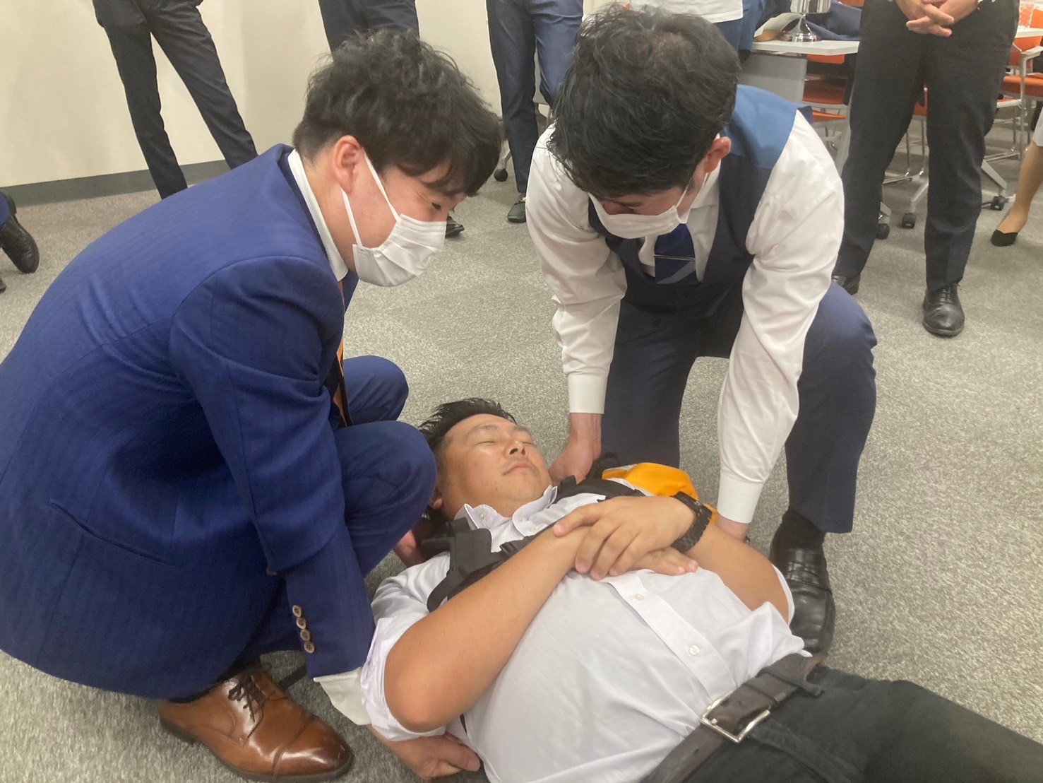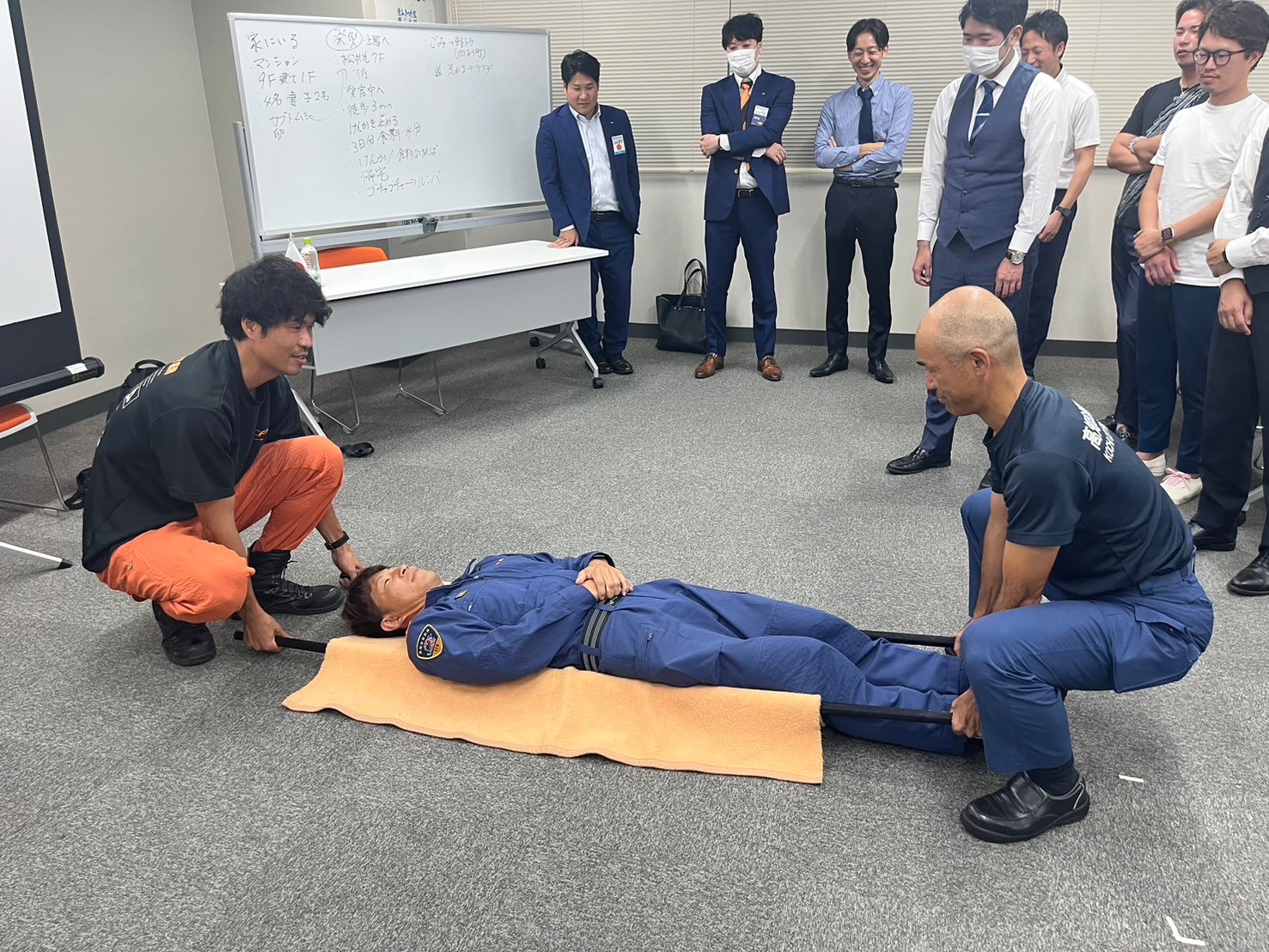 講演終了後は実際に被災した際の自助を想定した救助実演を行っていただき、参加したメンバーも実際に体験。南海トラフ地震の脅威が消えない高知県に住む以上、自助の意識は非常に重要となります。知識としてあるだけではなく、こうして実際に「やってみる」ことは重要なことだと感じました。