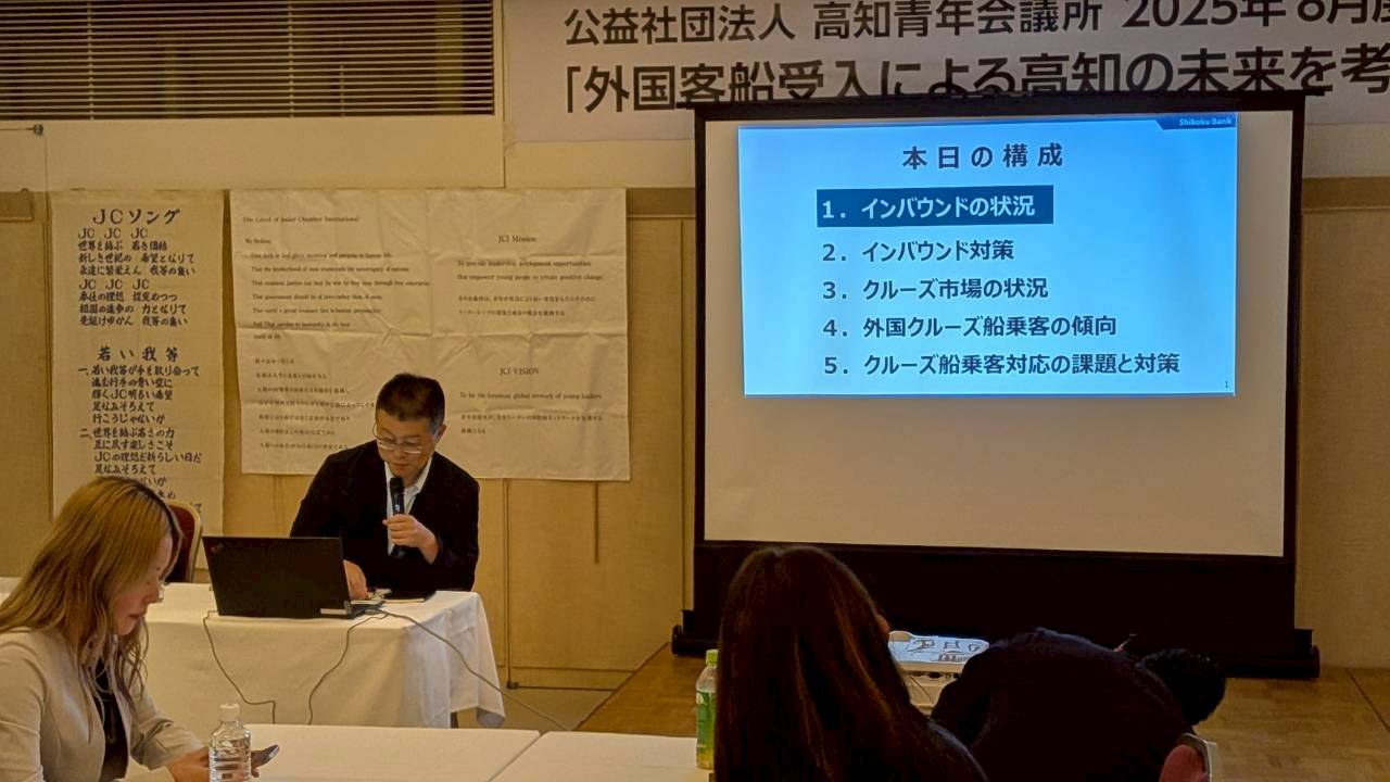 令和7年8月20日(水)、8月度定例会「外国客船受入による高知の未来を考える会」がラ・ヴィータにて開催されました。 当定例会では、講師として株式会社四銀地域経済研究所代表取締役社長岩井俊介先生をお招きし、高知のインバウンド需要をテーマにご講演いただきました。 高知県は、外国船の入港や国際線開発とインバウンド需要が年々増加傾向にあります。 このインバウンド需要をいかにして生かし高知県の経済効果……